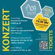 Heute sind es nur noch dreißig Tage bis zu unserem Herbstkonzert am Sonntag, dem 16. November 2025 um 15:30 Uhr im Kammermusiksaal der Philharmonie und wir freuen uns auf Ihr und euer zahlreiches Kommen. Tickets gibt es unter www.aob-ev.de und über den QR-Code auf dem angehängten Flyer. Sie kosten zwischen 20 und 30 €; für Schülerinnen und Schüler sowie Studierende gibt es eine Ermäßigung in Höhe von 5 €.